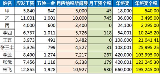 案例2:乙月应税所得10000元,当月发放年终奖36000元,月工资10000元减3500元免征额,按适用税率20%和速算扣除数555计算(10000-3500)×20%-555=745元;年终奖36000元,除以12个月为3000元,对应适用税率10%和速算扣除数105计算,即:36000×10%-105=3495元。总计应缴个税745+3495=4240元。
